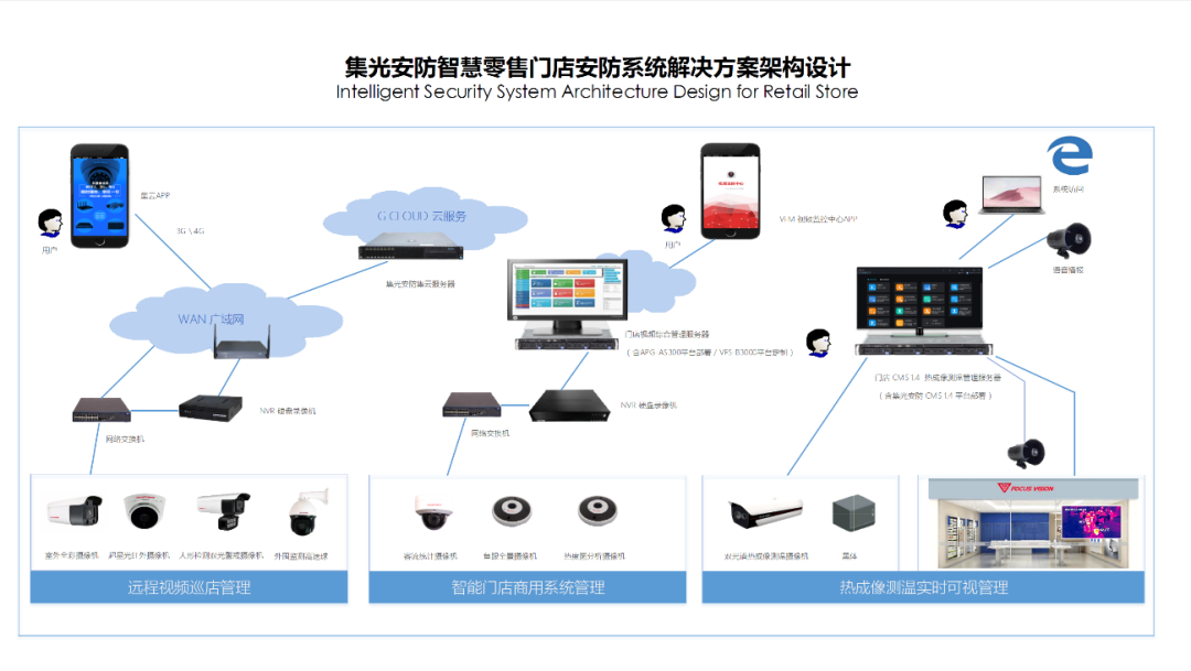 leyu.樂魚安防雙光智能警戒系統 支持門店部署,攝像機部署于門店出入口, 除可滿足門店視頻監控功能外,當顧客進店時,該系統可第一時間通過前沿人形檢測視頻分析技術識別顧客進店狀態,按后臺預設歡迎語播報歡迎語音進行提醒,便于店員及時提供接待服務,提升門店新老顧客進店的體驗及滿意度,系統支持leyu.樂魚安防G-Cloud集云移動客戶端遠程視頻管理、報警郵件推送。