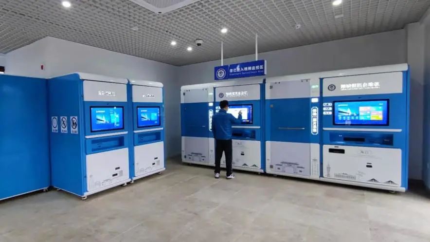藍白色的自助一體機整齊排列,科技感十足